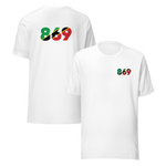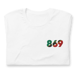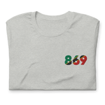 Show your Kittitian and Nevisian pride with our iconic Dial Code design. This premium t-shirt features the St. Kitts & Nevis area code +869, intricately embroidered and filled with the islands' vibrant flag colours (Green, Yellow, Black, and Red).