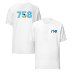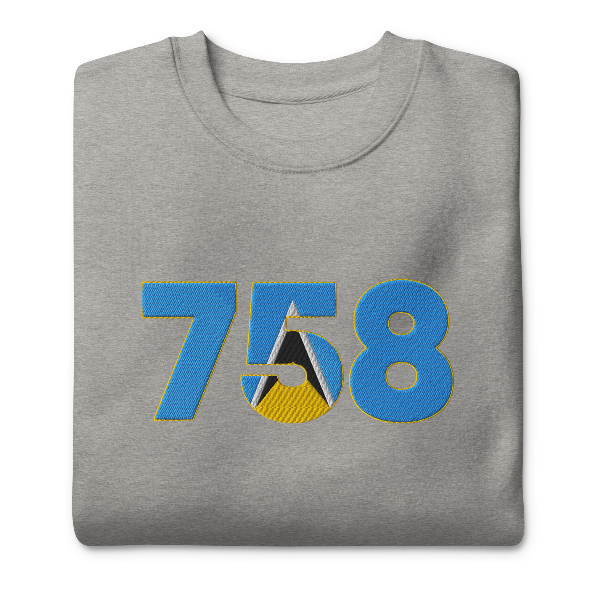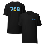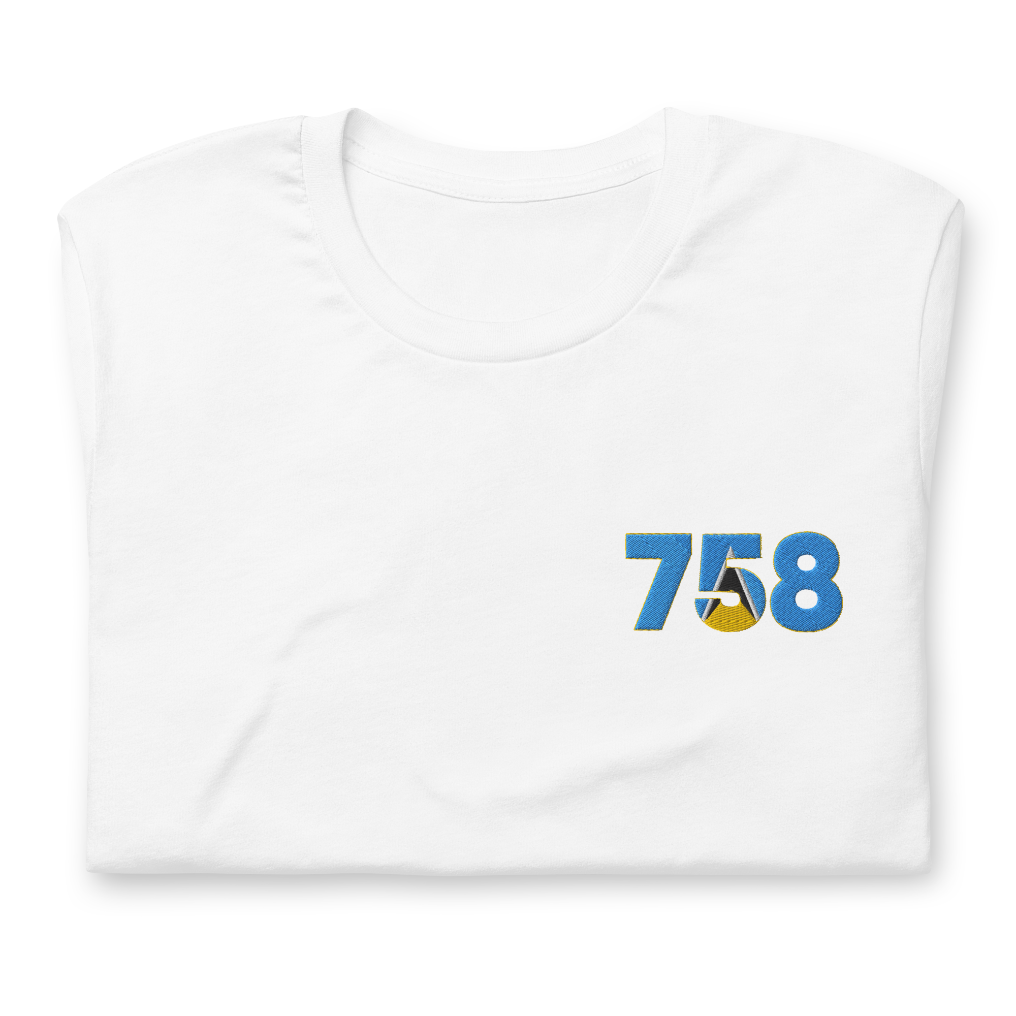 Show your Lucian pride with our iconic Dial Code design. This premium t-shirt features the St Lucia area code +758, intricately embroidered and filled with the island's vibrant flag colours (Blue, Gold, Black, and White).